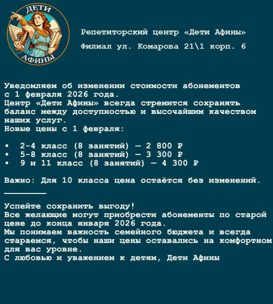 Уведомляем об изменении стоимости абонементов с 1 февраля 2026 года.