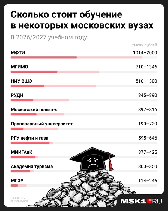 Родители выпускников, держитесь — за сердце и кошелек. Топовые и просто крупные московские вузы уже опубликовали цены на 2026/2027 учебный год. Стоимость первого курса сопоставима с покупкой новой машины — программы дешевле миллиона в год еще нужно поискать. Так что сейчас самое время понять, к каким тратам готовиться, если не пройти на бюджет.